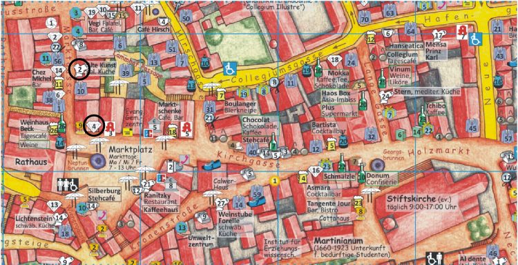 Der Tübinger Einzelhandel wurde in mit knapp 30 Symbolen versehenen Kategorien eingeteilt und auf der Karte sowie in einem Stichwortregister mit Koordinaten aufgeführt. Restaurants, Kneipen, Hotels, Cafés und Imbisse wurden schwerpunktmäßig auch direkt in der Karte beschriftet. Dabei sind sowohl der Name und die jeweilige Küche als auch die Möglichkeit der Außenbewirtung vermerkt.