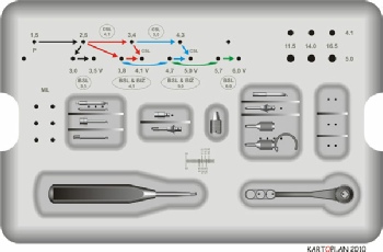 OP-Tray „Das OP-Tray ist sterilisierbar und bietet Platz für alle BPI-Werkzeuge und Bohrer. Der Farbpfad auf der beigelegten Schablone gibt Auskunft über die Bohrerreihenfolge während der Implantation“. BPI-Biologisch Physikalische Implantate GmbH & Co. KG